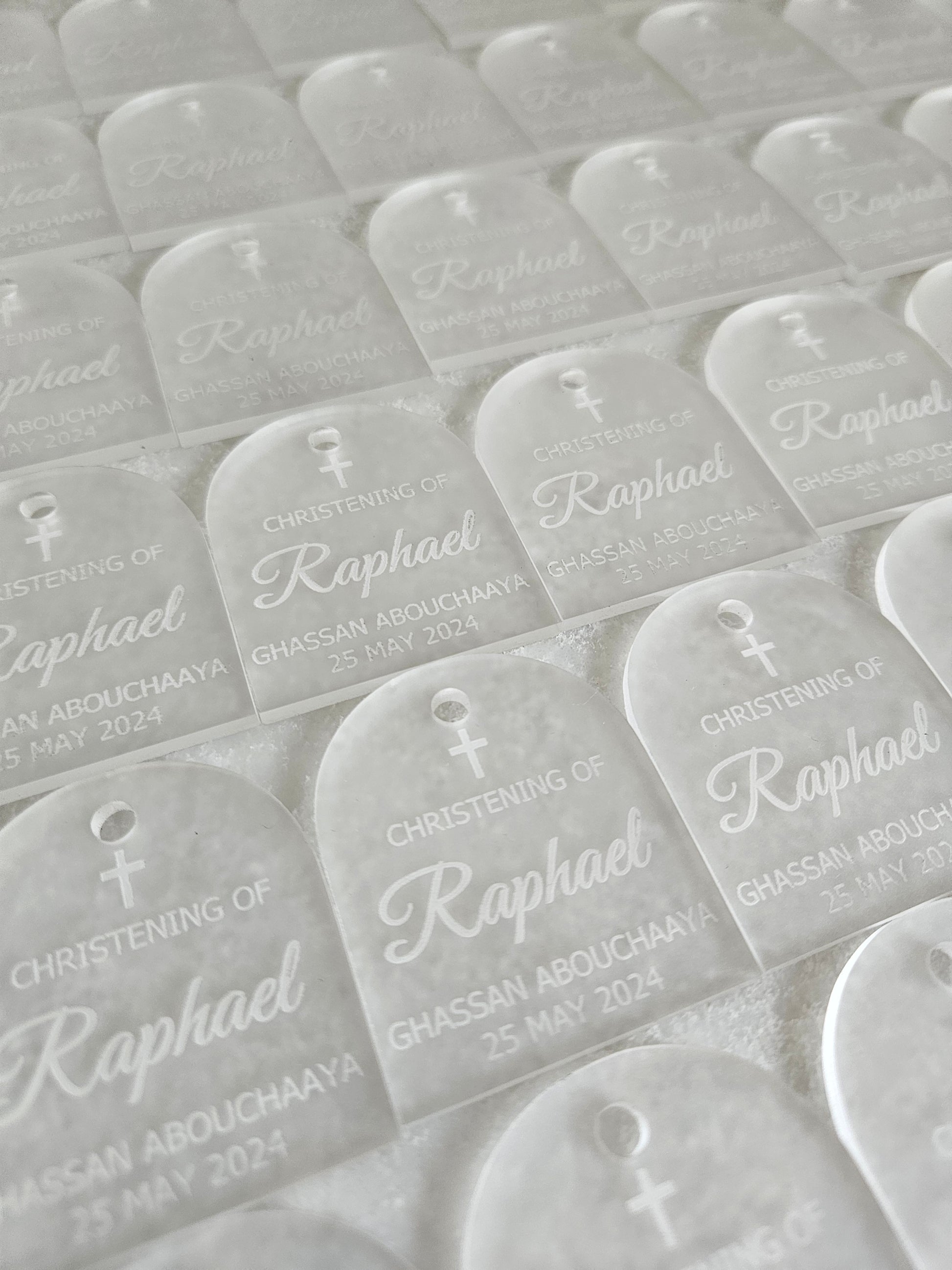Our custom Arch Tags are 3mm thick and come in 3 sizes. These tags are the perfect touch for your favours to stand out and appreciated by your guests.